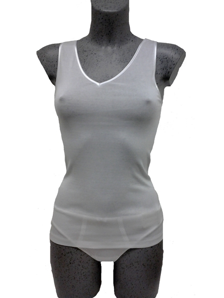 Modèle de débardeur en coton uni blanc. 100% fil d'écosse. Les bretelles sont gansées de satin ainsi que le décolleté en V. Ce modèle est un basique de la collection permanente Oscalito. Léger et peu épais il se porte en guise sous-vêtement. Dans la même gamme existe le caraco et le tee-shirt manches courtes.