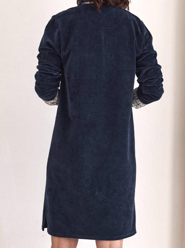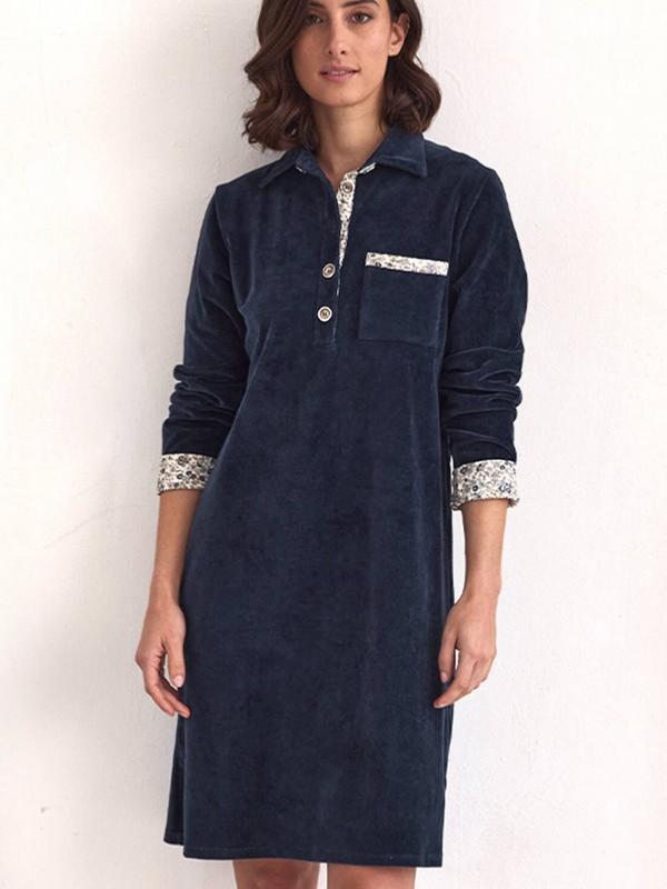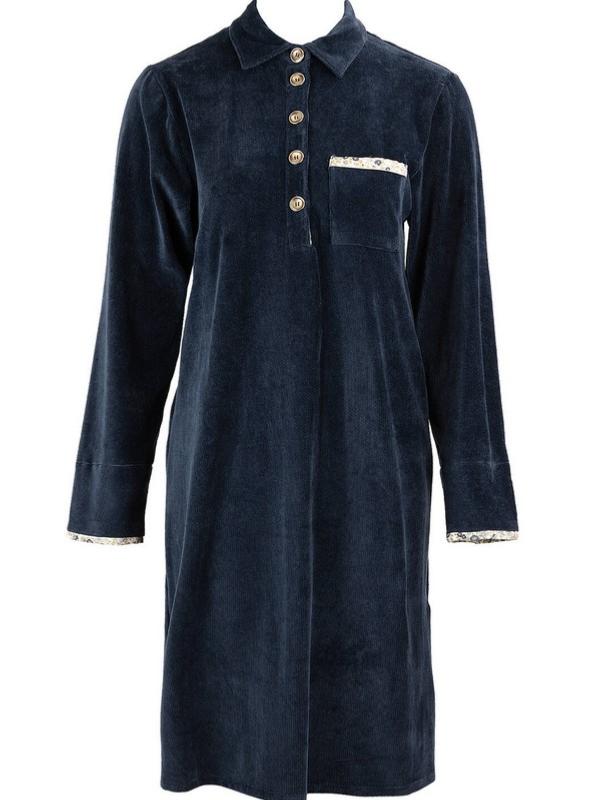 Collection "Yani" robe d'intérieur en velours côtelé marine avec encolure col chemise, poche poitrine décorative, fente discrète en bas de modèle et finitions en tissu liberty chic et rétro.