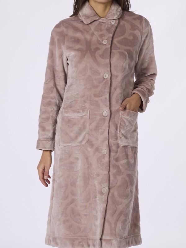 Collection "Goya" robe de chambre boutonnée en tissu polaire texturé beige avec col chemisier et poche plaquée de chaque côté.