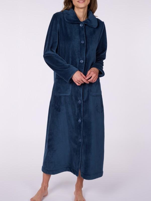 Collection "Must 5" robe de chambre longue boutonnée en tissu polaire recyclé uni coloris bleu foncé, poche plaquée de chaque côté et longueur 130 cm.