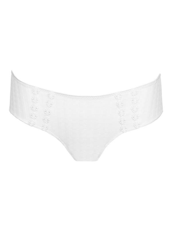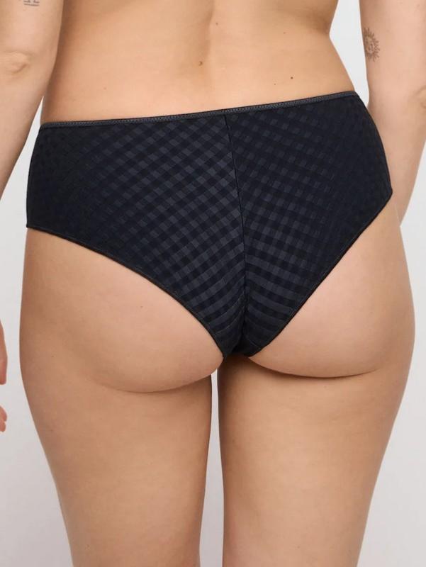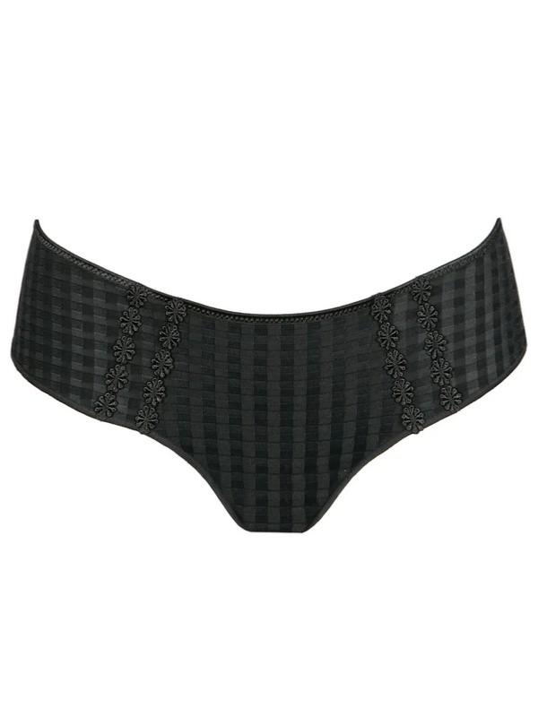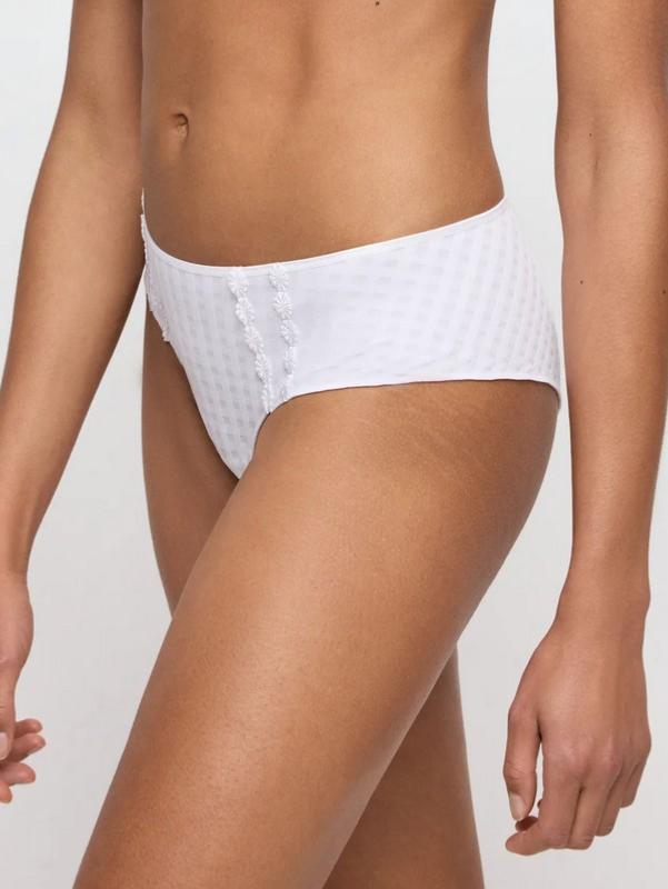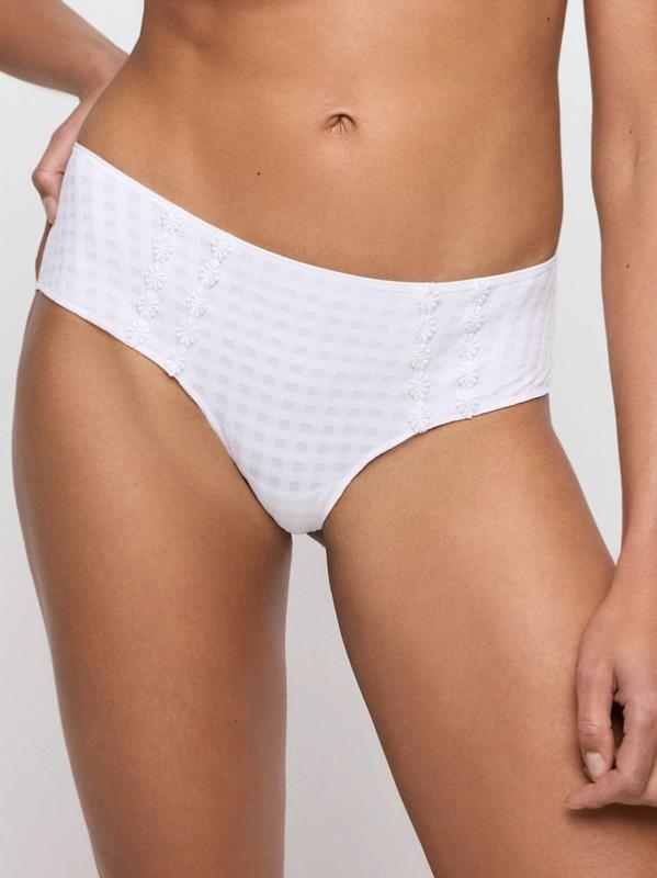 Modèle de shorty en maille extensible de la ligne Avero de la marque de lingerie Marie Jo à carreaux ton sur ton coloris uni en tissu opaque sur le devant et dans la dos. La coupe est couvrante pour ce modèle au tour de taille et cuisses élastiqués. Petite fleurs de finition en guipure à l'avant et fond du modèle doublé 100ù coton.