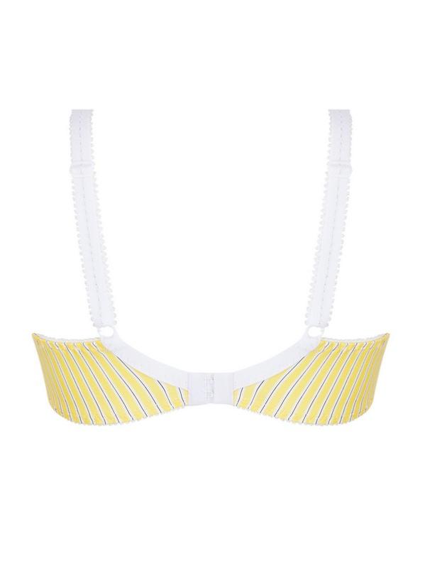 Collection "Un Brin Garçonne" soutien-gorge armatures bien-être en maille douce et tonique imprimé rayures fines sur fond jaune pour un bon maintien dans les grandes tailles.