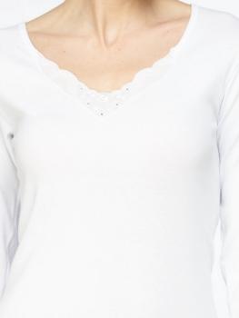 Tee-shirt manches longues en coton peigné blanc col V dentelle